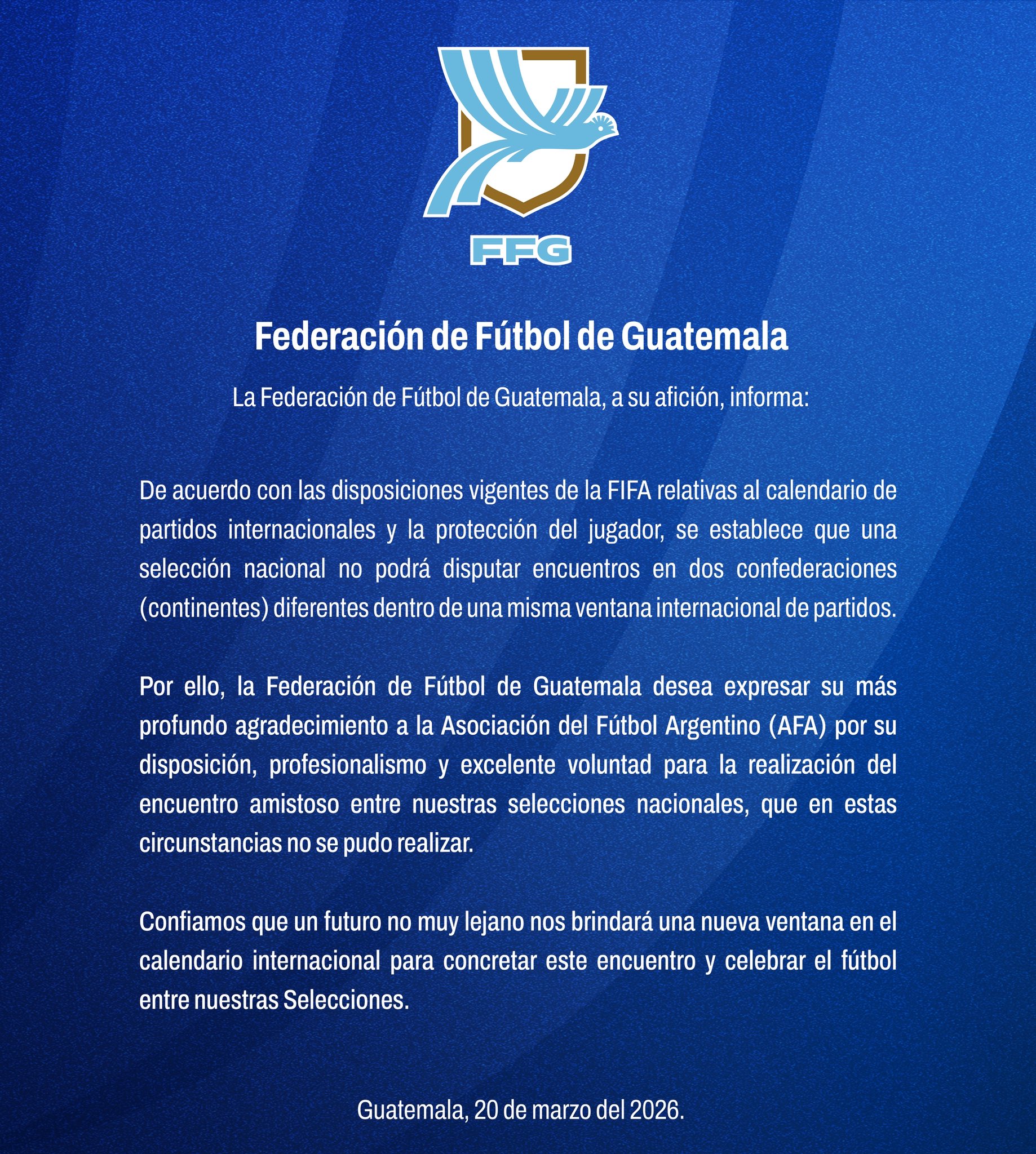 En seguida, la FFG acota: "La Federación de Futbol de Guatemala desea expresar su más profundo agradecimiento a la Asociación del Futbol Argentino (AFA) por su disposición, profesionalismo y excelente voluntad para la realización del encuentro amistoso entre nuestras selecciones nacionales, que en estas contumacias no se pudo realizar".