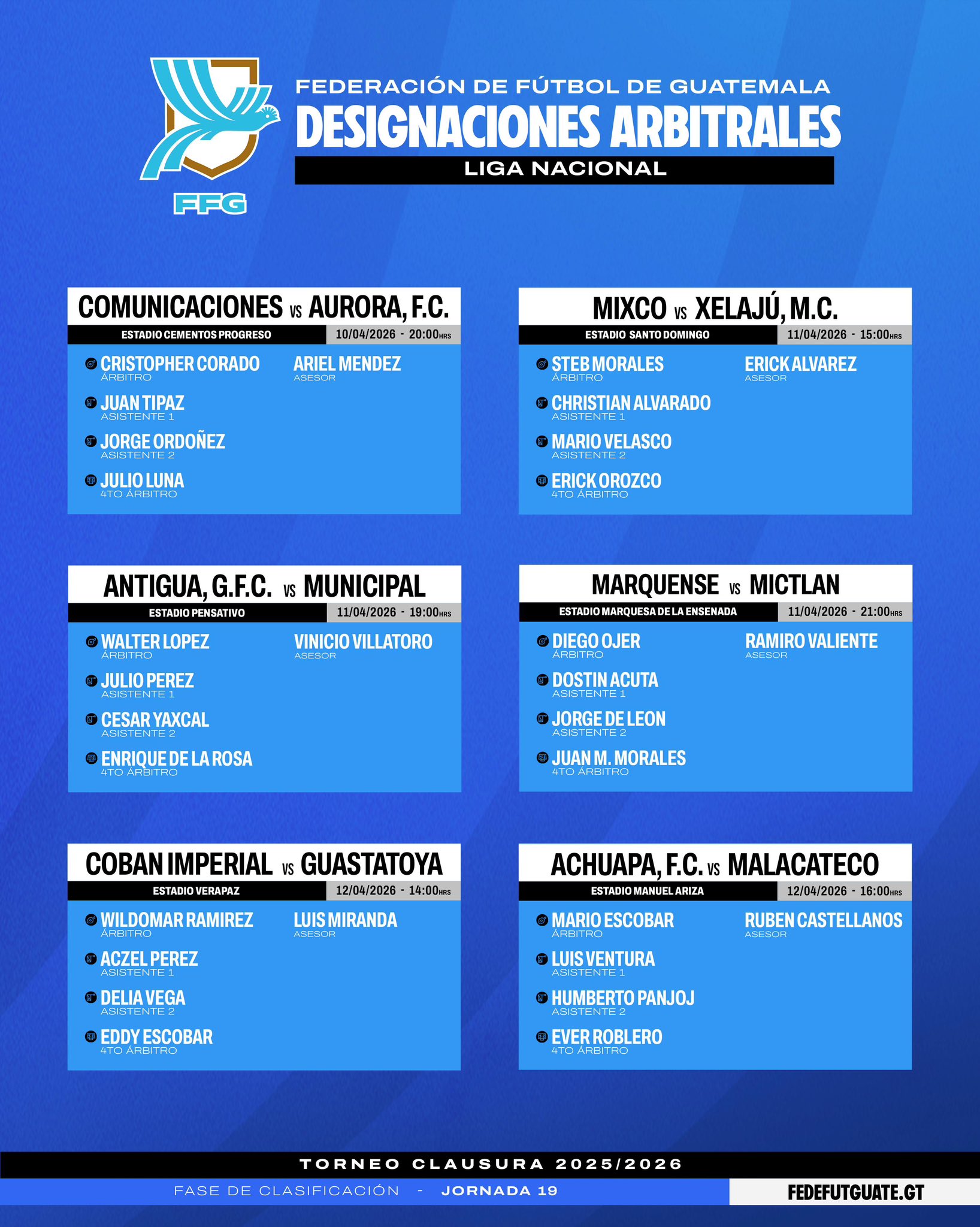 Este viernes 10 de abril se inicia la fecha 19 del Torneo Clausura 2026 de la Liga Nacional, donde Xelajú quiere mantener el liderato y acercarse matemáticamente a ser el primero en clasificar a los cuartos de final. Por su parte, Municipal, Comunicaciones, Mixco, Cobán Imperial y Antigua G. F. C. no quieren perderle el paso al líder quetzalteco. Y en la zona baja, se vivirá una fecha trepidante donde Deportivo Achuapa puede quedar anticipadamente con la etiqueta del primer descendido y una lucha intensa entre los equipos que están a tres puntos del descenso, entre ello el "Albo".