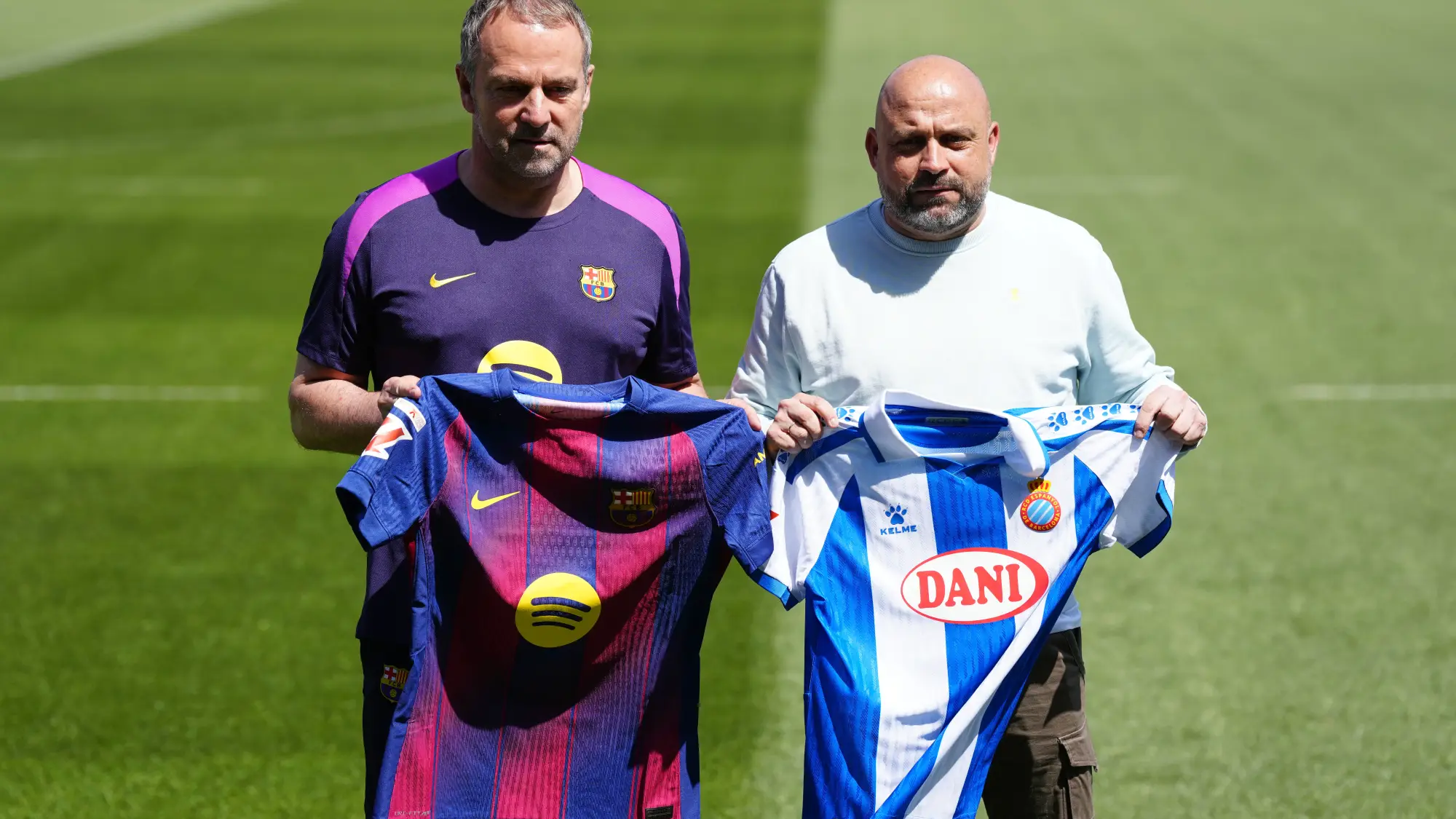 El entrenador del Barcelona, Hansi Flick, y el del Espanyol, Manolo González, han posado juntos en el campo Tito Vilanova de la Ciudad Deportiva Joan Gamper antes del derbi que se disputará este sábado.
