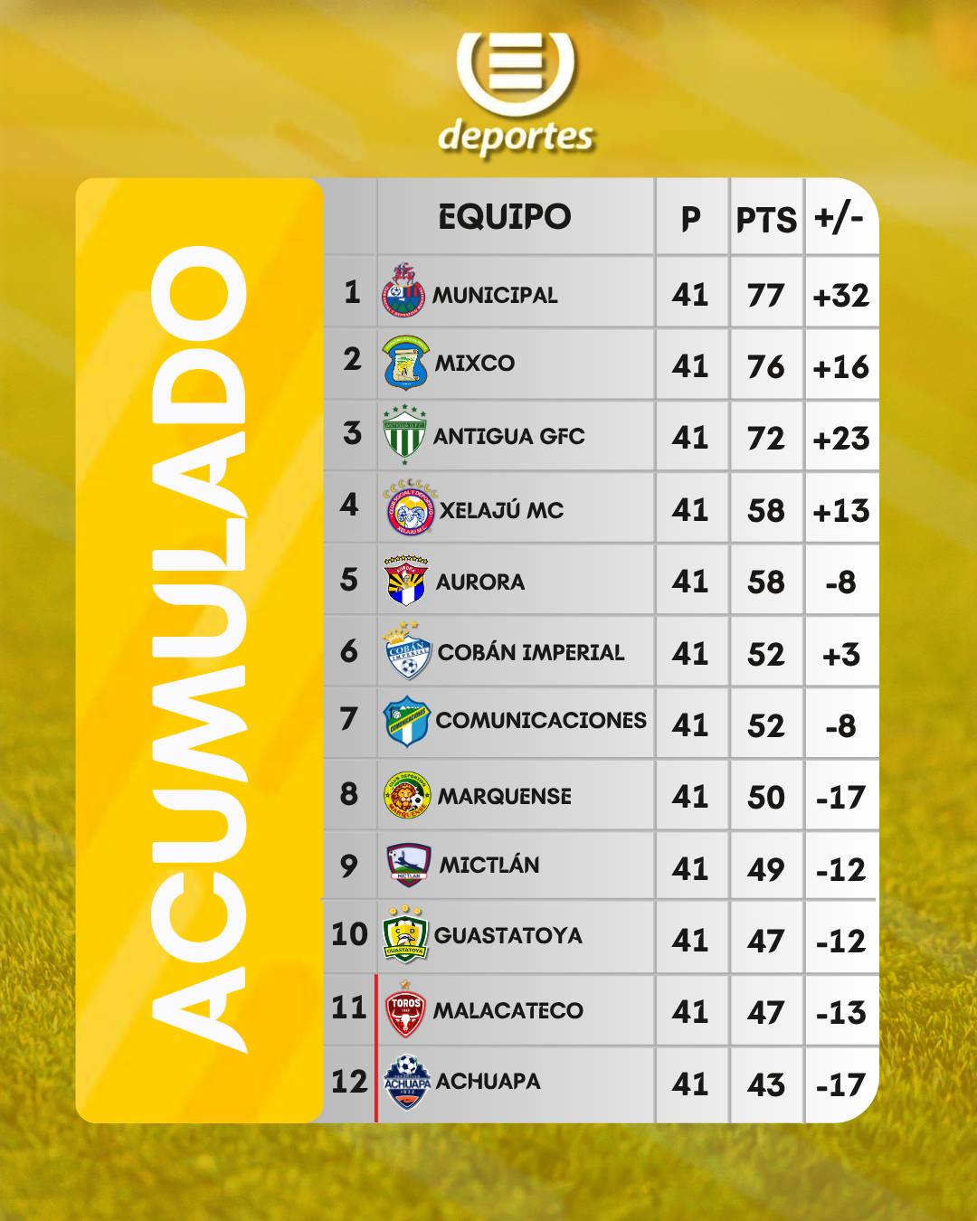 El penúltimo lugar, también zona de descenso, ahora es para Malacateco con 47 puntos, que fue superado por Guastatoya (47 puntos) por mejor diferencia de gol, y eso hace que Malacateco ya no dependa de sus propios resultados para salvar la categoría tomando en cuenta que sus rivales son Cobán Imperial, Antigua y Comunicaciones.