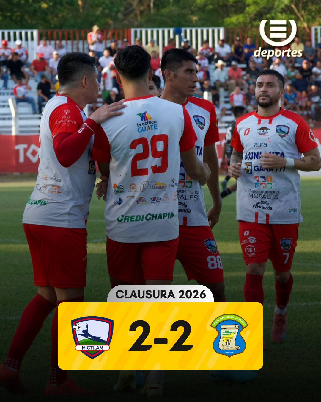 En el estadio La Asunción de Asunción Mita, Jutiapa, el Atlético Mictlán recibió al Deportivo Mixco en la continuidad de la fecha 20 del Torneo Clausura 2026 que ha entrado en la recta final de su fase regular y el panorama empieza a ponerse claro respecto al tema de los clasificados a cuartos de final, donde los dirigidos por el técnico nacional, Fabricio Benítez, logró esta noche su boleto a la instancia final gracias al empate 2-2.