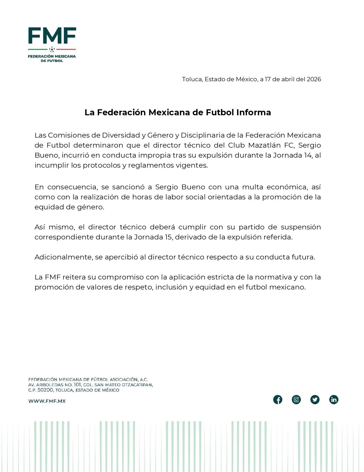 La Federación Mexicana de Futbol (FMF) informó que sancionó al director técnico del Club Mazatlán, Sergio Bueno, por su conducta "impropia" durante un partido hacia la árbitra Katia Itzel García, quien participará en la cita mundialista 2026.