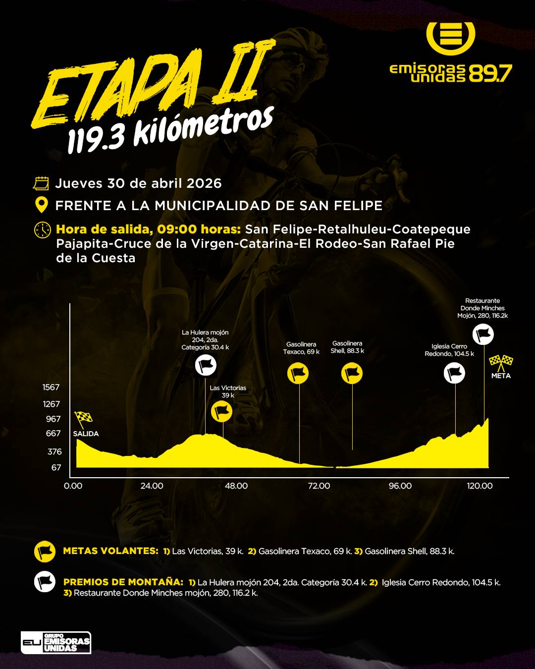 Tras solventada la primera etapa de la Vuelta Bantrab 2026, este jueves 30 de abril se celebrará la segunda jornada, la cual tendrá un recorrido de 119.3 kilómetros entre el parque central de San Felipe, Retalhuleu, y la Municipalidad de San Rafael Pie de la Cuesta, San Marcos.