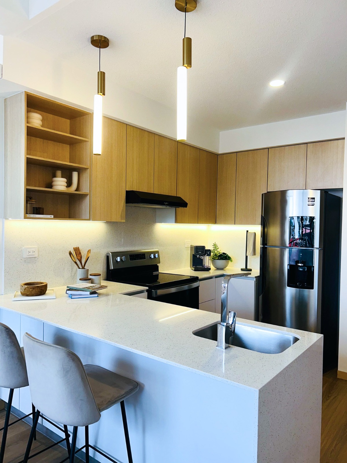 El complejo está conformado por dos torres de 13 y 14 niveles que ofrecen apartamentos de una, dos y tres habitaciones. Cada unidad está diseñada con acabados de alta calidad y un enfoque en la eficiencia espacial. Además, se incluyen amenidades de última generación, como centro de negocios, salón panorámico, piscina, gimnasio, áreas de juegos infantiles y zonas verdes, creando un ecosistema pensado para todas las etapas de vida.