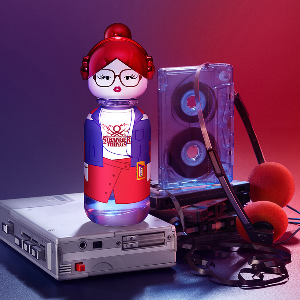 El frasco, con cabello rojo recogido en una cola alta, representa a la "sister" más valiente: audaz, expresiva y lista para cruzar dimensiones. Su diseño evoca el espíritu rebelde y femenino de los años 80, combinando estilo retro con un mensaje atemporal sobre la amistad y la autenticidad.