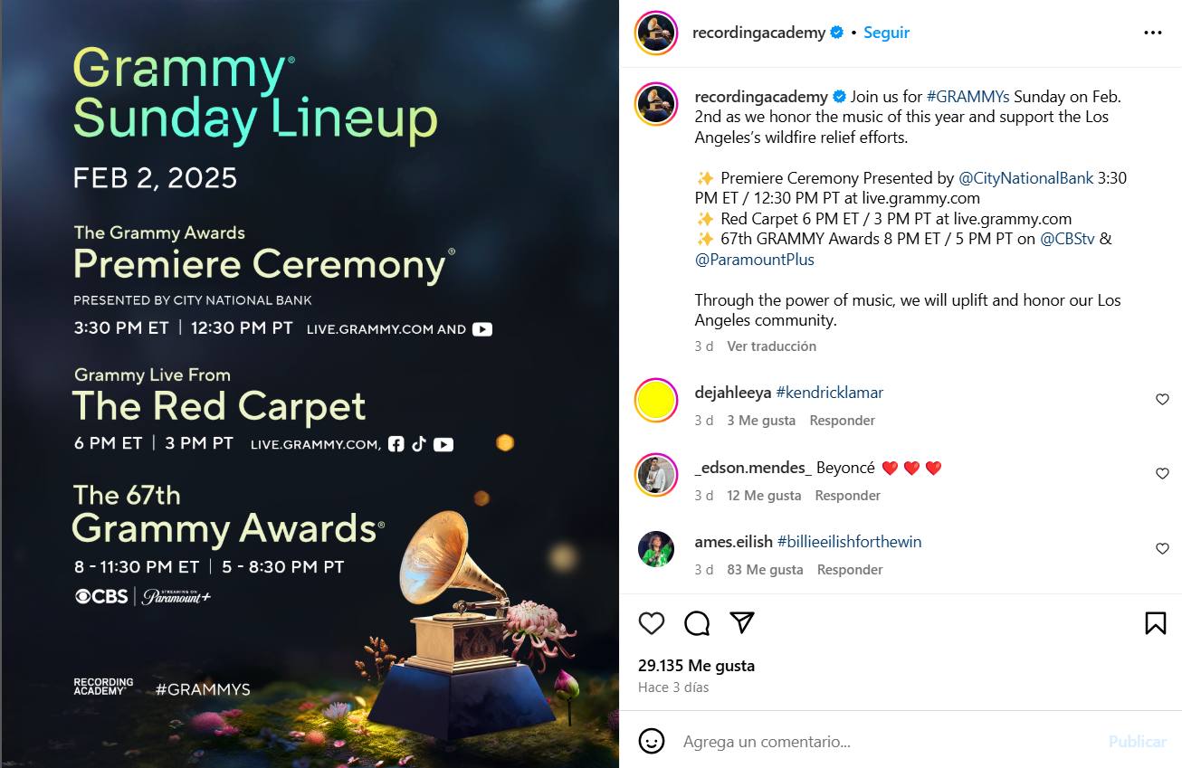 La ceremonia, organizada por la Academia Nacional de Grabación de Artes y Ciencias de Estados Unidos, premia a los artistas, composiciones y grabaciones más destacadas de la industria musical.