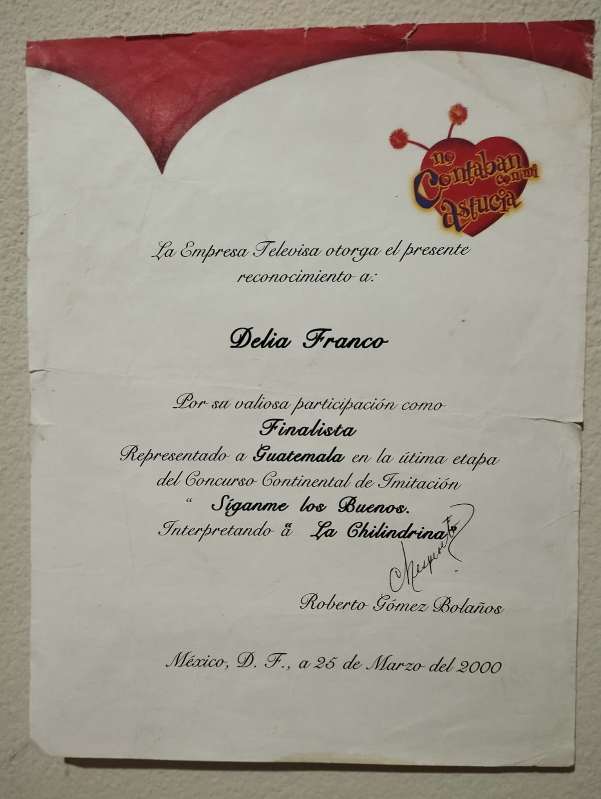 "El concurso inició en Guatemala en la Feria de la Alegría. Los ganadores representarían a nuestro país en un evento de Televisa imitando a los personajes de la vecindad del Chavo del 8. Yo obtuve el primer lugar en imitar a La Chilindrina y en México llegue a la final. Para mí el premio fue la experiencia de poder conocer a tantas personas", nos detalla Delia.