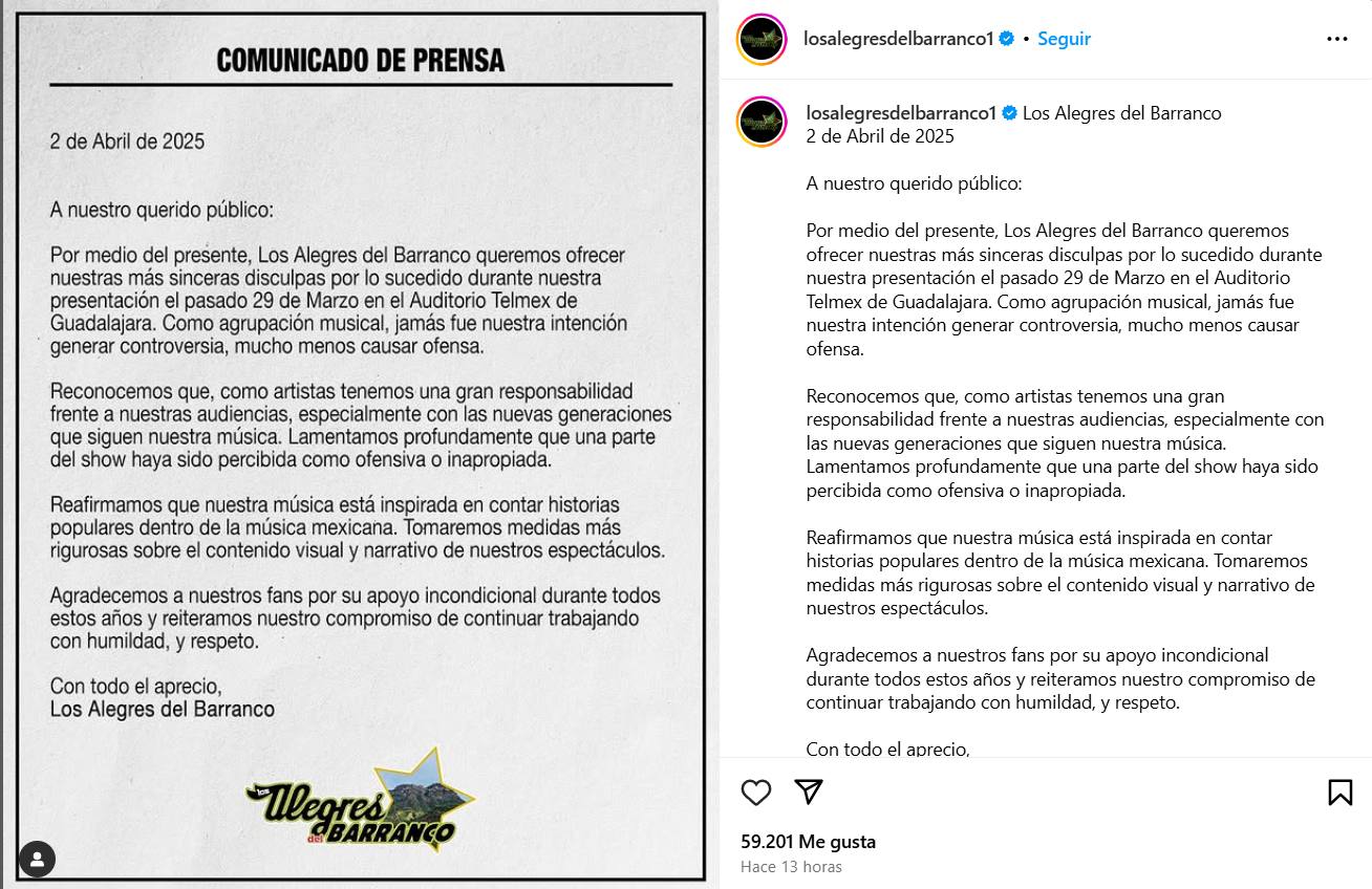 En un comunicado y un video publicados en sus redes sociales, el conjunto sinaloense ofreció una disculpa por los hechos ocurridos el sábado (29 de marzo) durante su presentación en el Auditorio Telmex, y expresó que, como agrupación, "jamás fue nuestra intención generar controversia, y mucho menos causar ofensa".