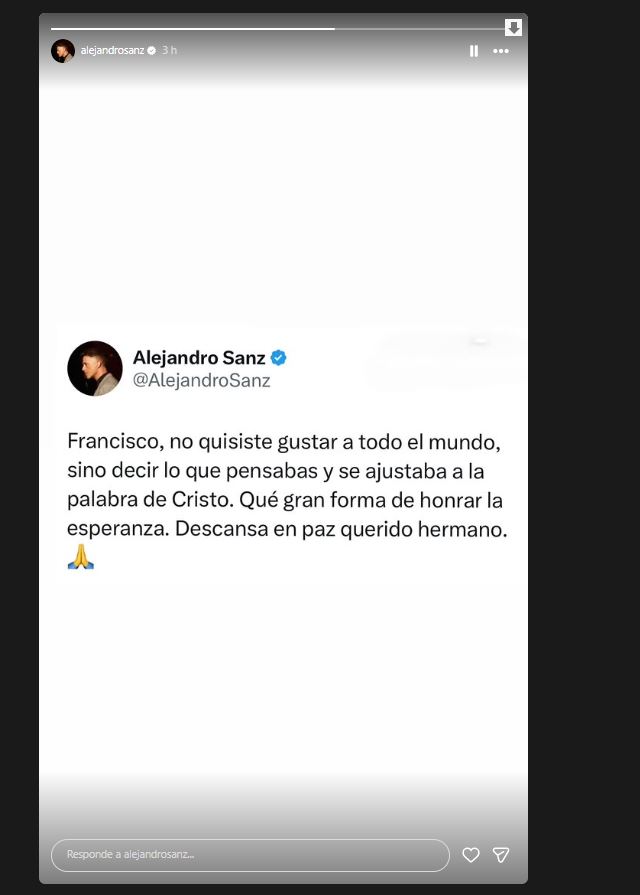 Alejandro Sanz. El cantante español compartió su pesar en redes sociales, destacando la humanidad y cercanía del Papa Francisco.
