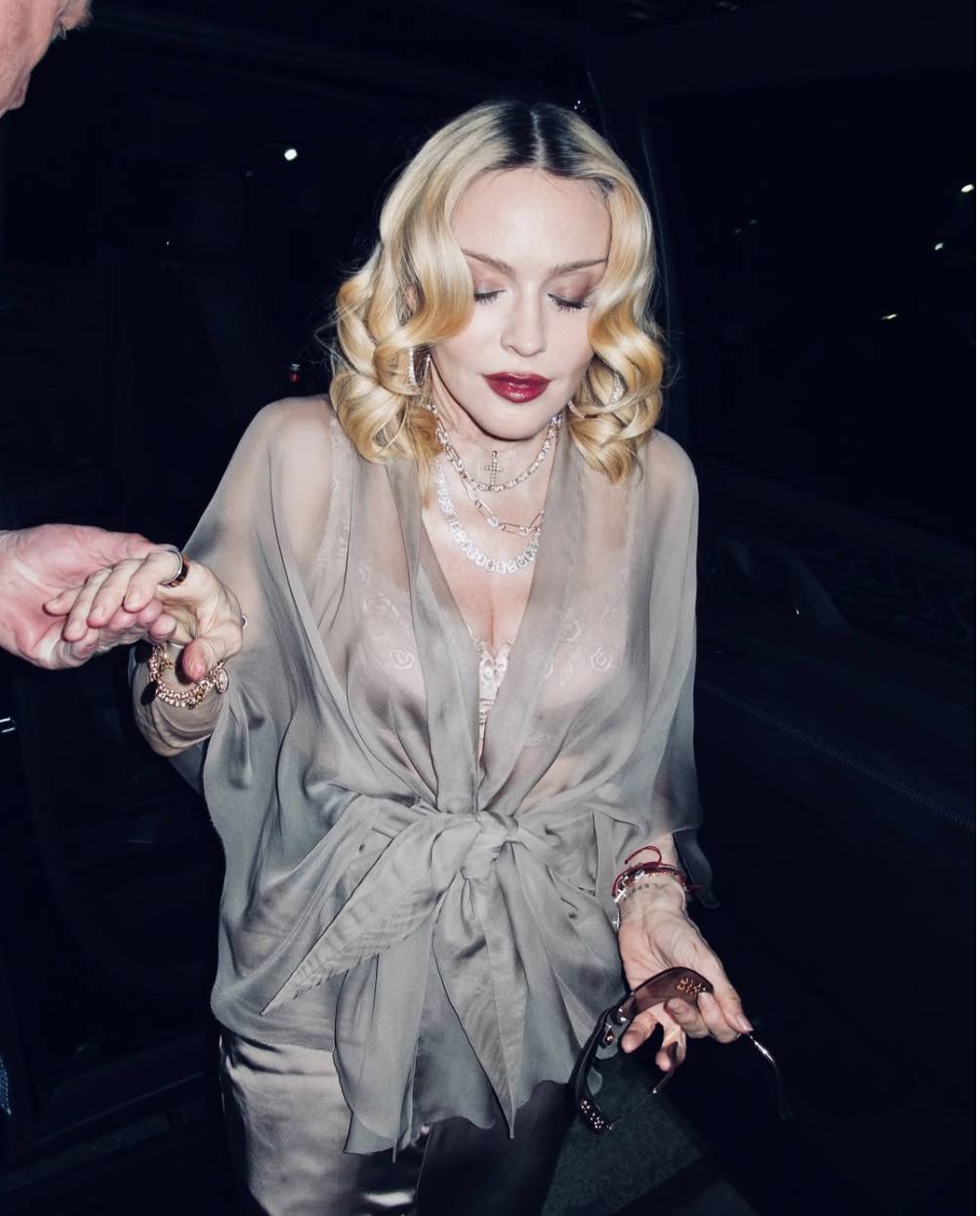 En la celebración, que tuvo lugar el pasado domingo, Madonna lució una blusa transparente atada al frente, que dejaba ver un sostén de encaje nude, y la combinó con un pantalón de seda color beige. Completó el look con gafas de sol, labios rojo oscuro, grandes aros y collares brillantes, mientras llevaba su cabello rubio en voluminosos rizos.