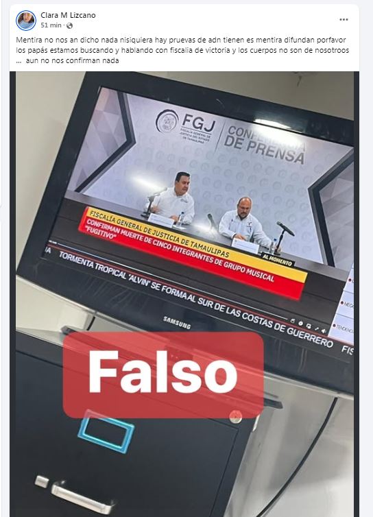 Sin embargo, Clara M. Lizcano, uno de los familiares de los desaparecidos, compartió en sus redes sociales que no han sido informados al respecto: "Mentira, no nos han dicho nada. Ni siquiera hay pruebas de ADN. Es mentira, por favor difundan. Los papás estamos buscando y hablando con la Fiscalía de Victoria, y los cuerpos no son de nosotros... aún no nos confirman nada. Necesito rueda de prensa, por favor necesitamos desmentir este caso para que no nos den carpetazo. A ellos aún no los encontramos. No sabemos nada de ellos".
