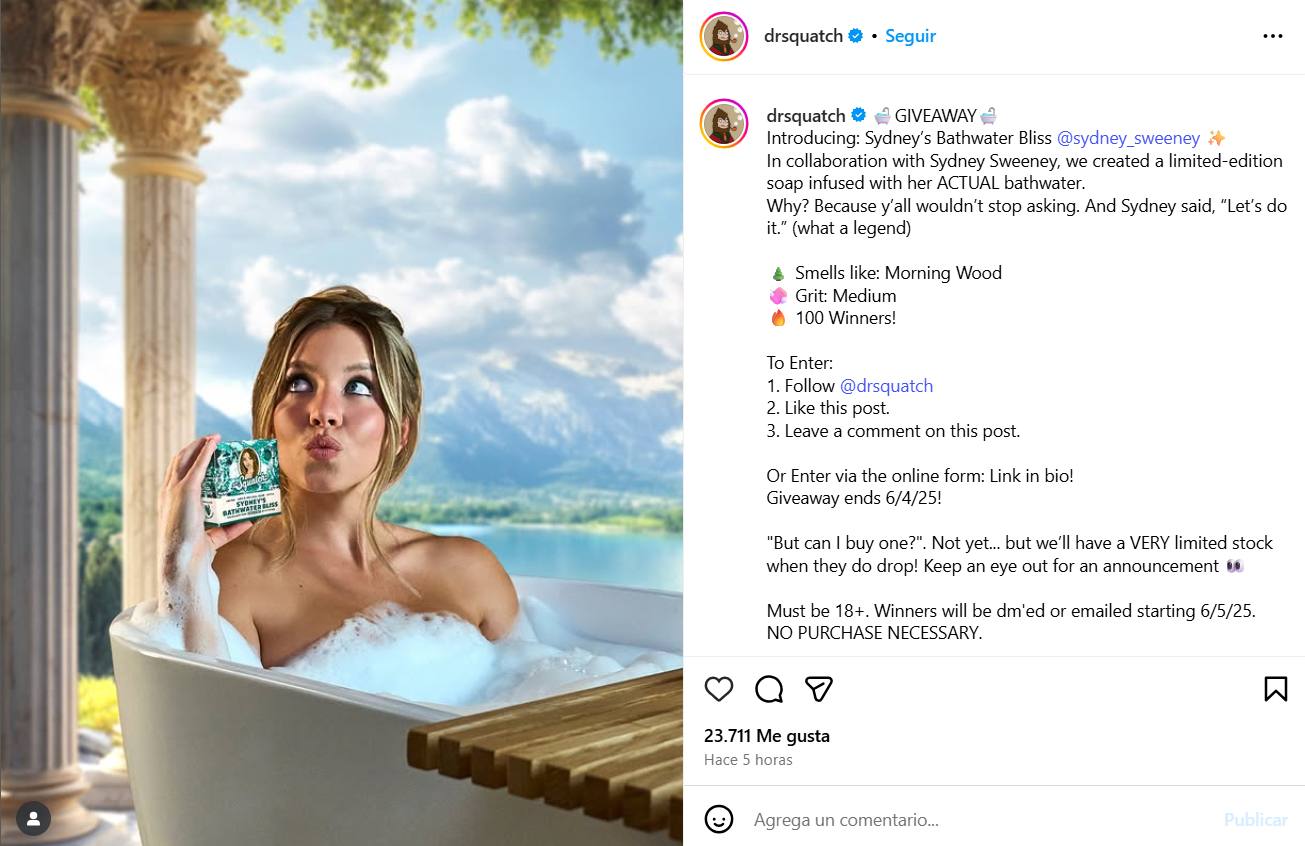 La estrategia publicitaria forma parte de una campaña más amplia en la que Sydney Sweeney ha participado como imagen de Dr. Squatch, promoviendo productos bajo un enfoque humorístico.