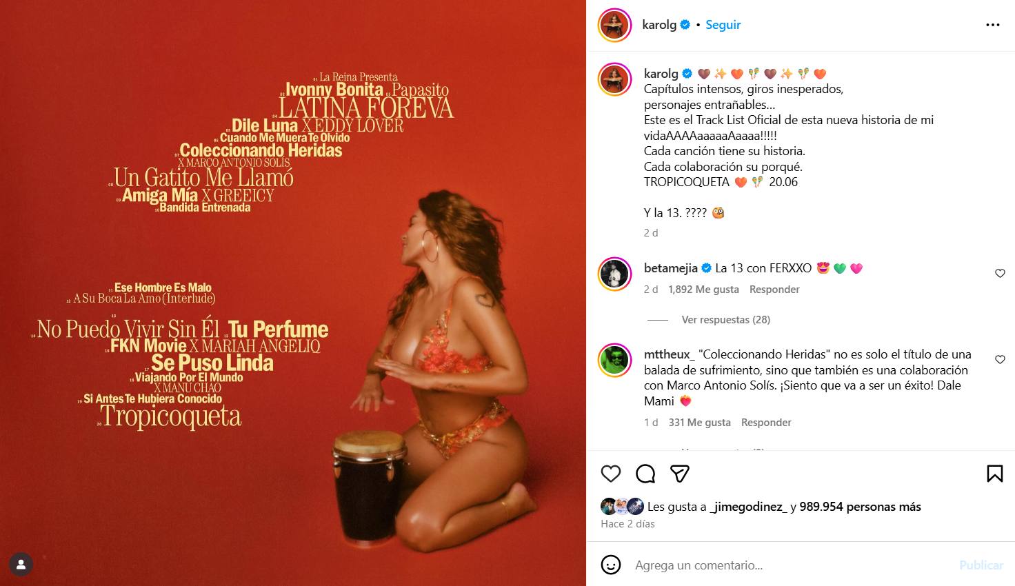 Son "canciones que se cantan con el alma, se bailan con el cuerpo y se gritan con el corazón", como señaló Karol G en su cuenta de Instagram, en la que califica su nuevo trabajo de "intenso, impredecible, dramático, mágico, auténtico, ÚNICO".