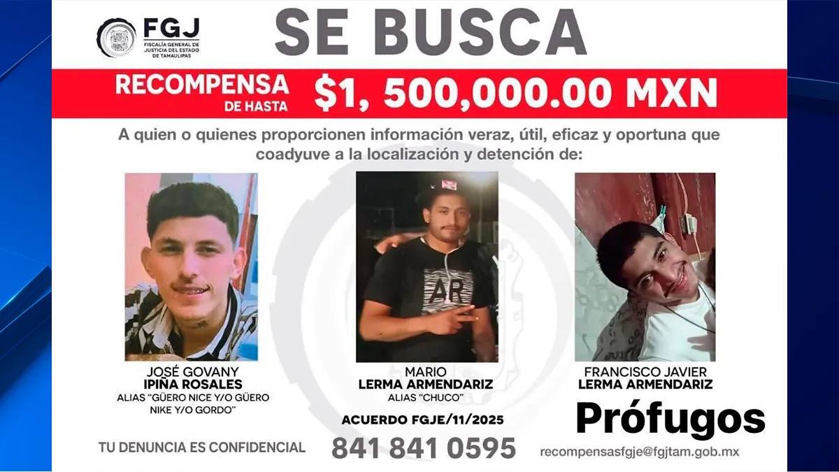 Una recompensa de un millón y medio de pesos mexicanos, (alrededor de 80 mil dólares) está siendo ofrecida por información veraz que permita localizar y detener a tres hombres que permanecen prófugos y presuntamente están relacionados con el crimen contra el Grupo Fugitivo.