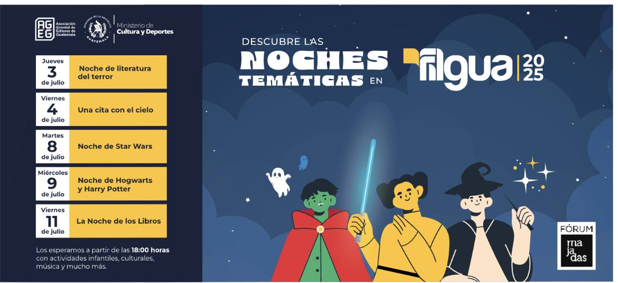 Las noches temáticas invitan a lectores de todas las edades a vivir experiencias únicas alrededor de la literatura, la fantasía, el amor y la imaginación. Este año, el evento de FILGUA se estará celebrando del 1 al 13 de julio en Fórum Majadas con decenas de expositores.