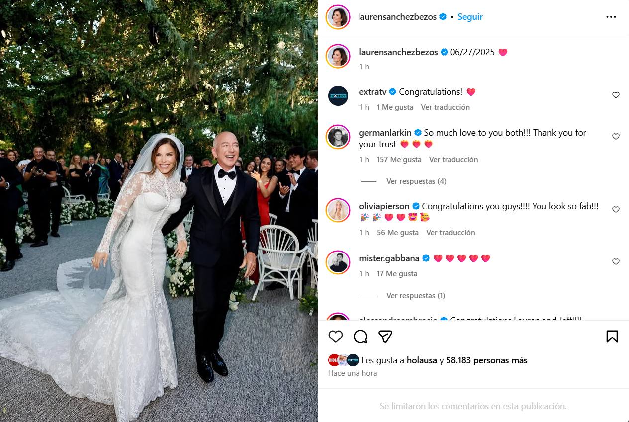 Tras darse el "sí, acepto", Lauren Sánchez no solo hizo cambio en sus redes sociales, como borrar todas sus fotografías, y publicar la más esperada por todos a lo largo de estos días: la primera con Jeff Bezos como marido y mujer.