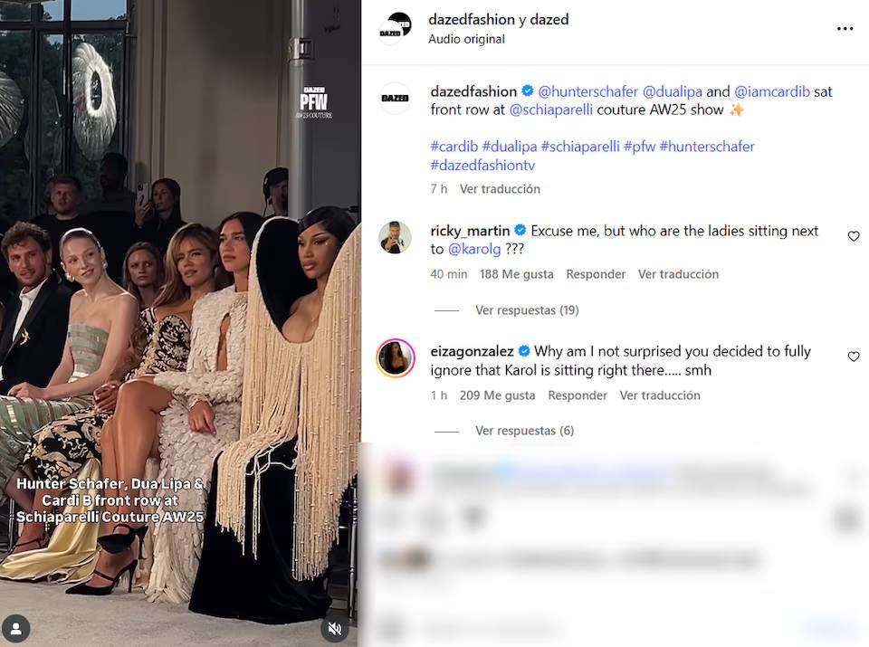 La polémica se dio luego de que el perfil de Dazed y Dazed Fashion hicieran mención de las famosas que estaban en primera fila. Mencionaron a Dua Lipa, Cardi B y Hunter Schafer omitiendo por completo a Karol G.