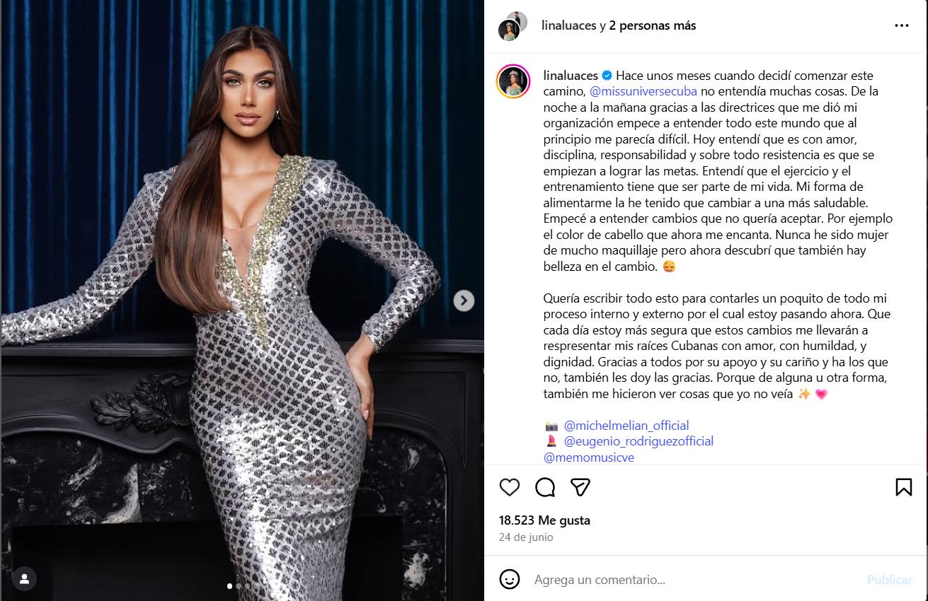 La modelo de 22 años compitió en nombre de Santiago de Cuba durante el evento celebrado en la ciudad de Miami. Tras ser nombrada como representante de la isla, Lina recibió la corona de su antecesora, Marianela Ancheta, ante el aplauso de los presentes en el certamen.