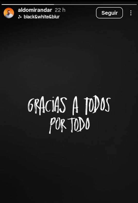 A través de su historia en Instagram, horas antes de morir, Aldo Miranda compartió un breve mensaje sobre fondo negro: "Gracias a todos por todo".