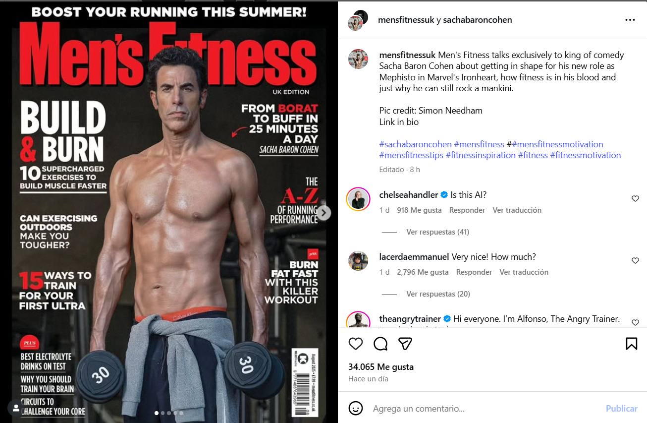 Para presumir su atlética figura, Sacha Baron Cohen se dejó ver si camisa y se mostró orgulloso en la nueva portada de Men’s Fitness en su edición de Reino Unido.