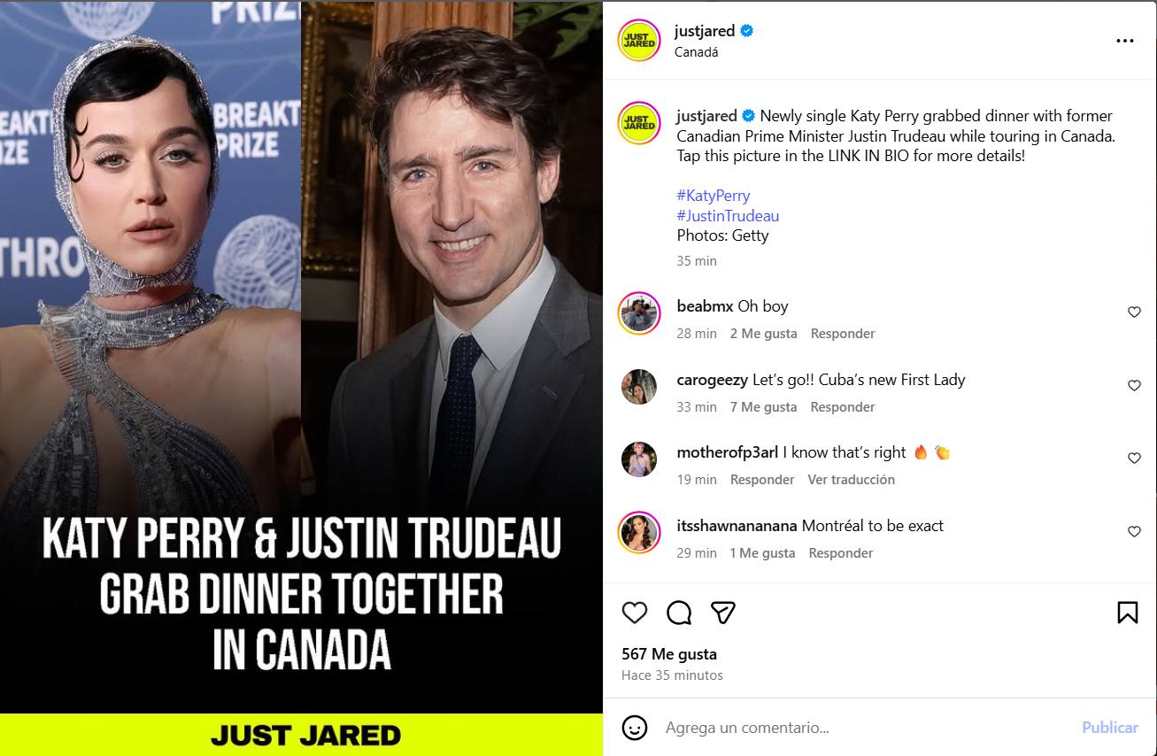 Katy Perry fue captada cenando con Justin Trudeau en el elegante restaurante Le Violon en Montreal, Canadá, según fotos obtenidas por el medio estadounidense TMZ.