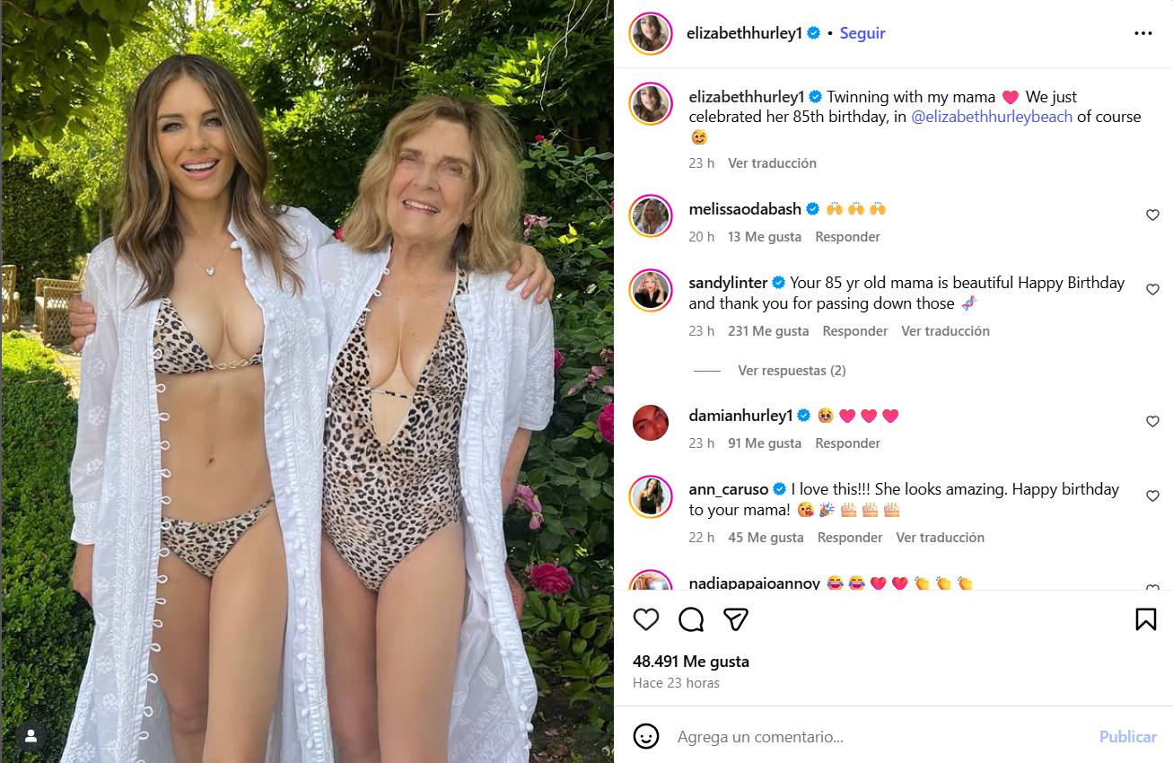 "Gemela con mi mamá ♥️ Acabamos de celebrar su 85 cumpleaños, en @elizabethhurleybeach por supuesto ?", escribió la actriz.