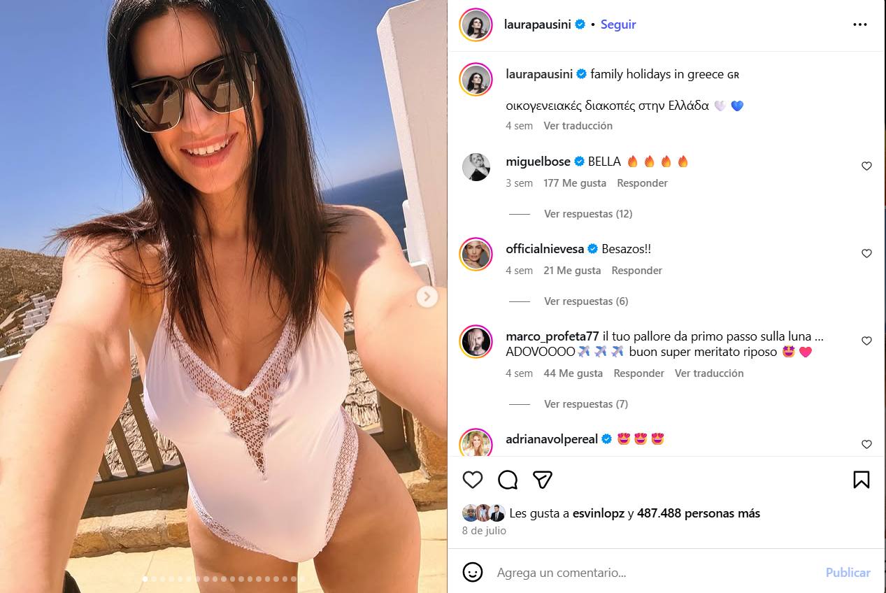 "Es lunes, es agosto, cero vacaciones pero muchas cosas de trabajo que hacer con una sonrisa gigante.. en bañador ?.. mil cosas random más ?.. y Laura Pausini", escribió en la publicación.
