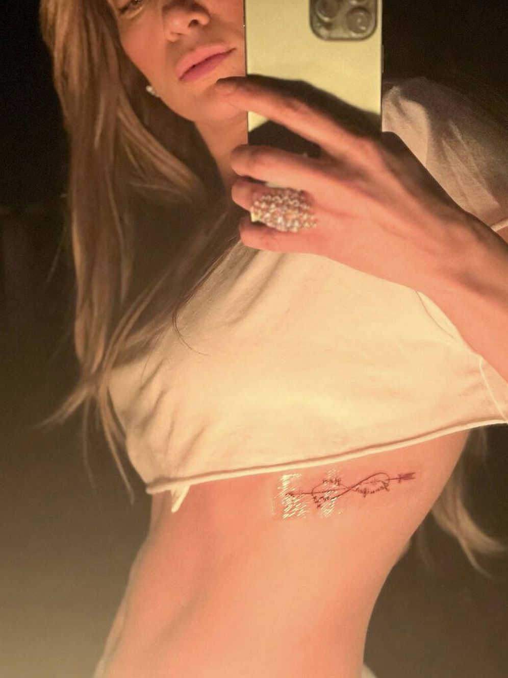 Jennifer López compartió las imágenes luciendo su nuevo tatuaje: un signo de infinito que parece tener los nombres Jennifer y Ben escritos en cursiva. Una flecha también atraviesa el centro del símbolo, que se encuentra por encima de su caja torácica.