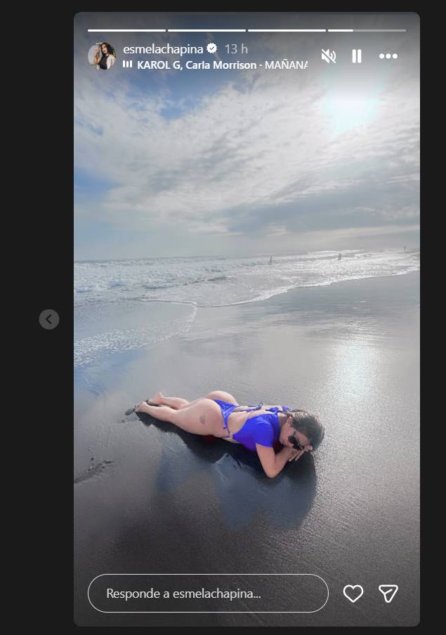 A través de sus historias de Instagram, Esme La Chapina compartió una candente imagen en la que aparece recostada boca abajo sobre la arena y presumiendo sus curvas en bikini.