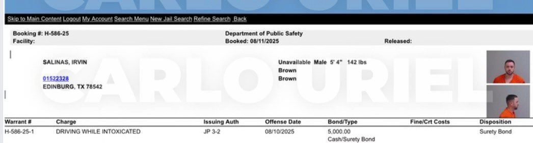 "Les puedo confirmar que el cantante Pee Wee fue arrestado nuevamente bajo el cargo de conducir en estado de ebriedad alrededor de las 10:00 pm del día de ayer domingo 10 de agosto de 2025 en Edimburg, Texas".