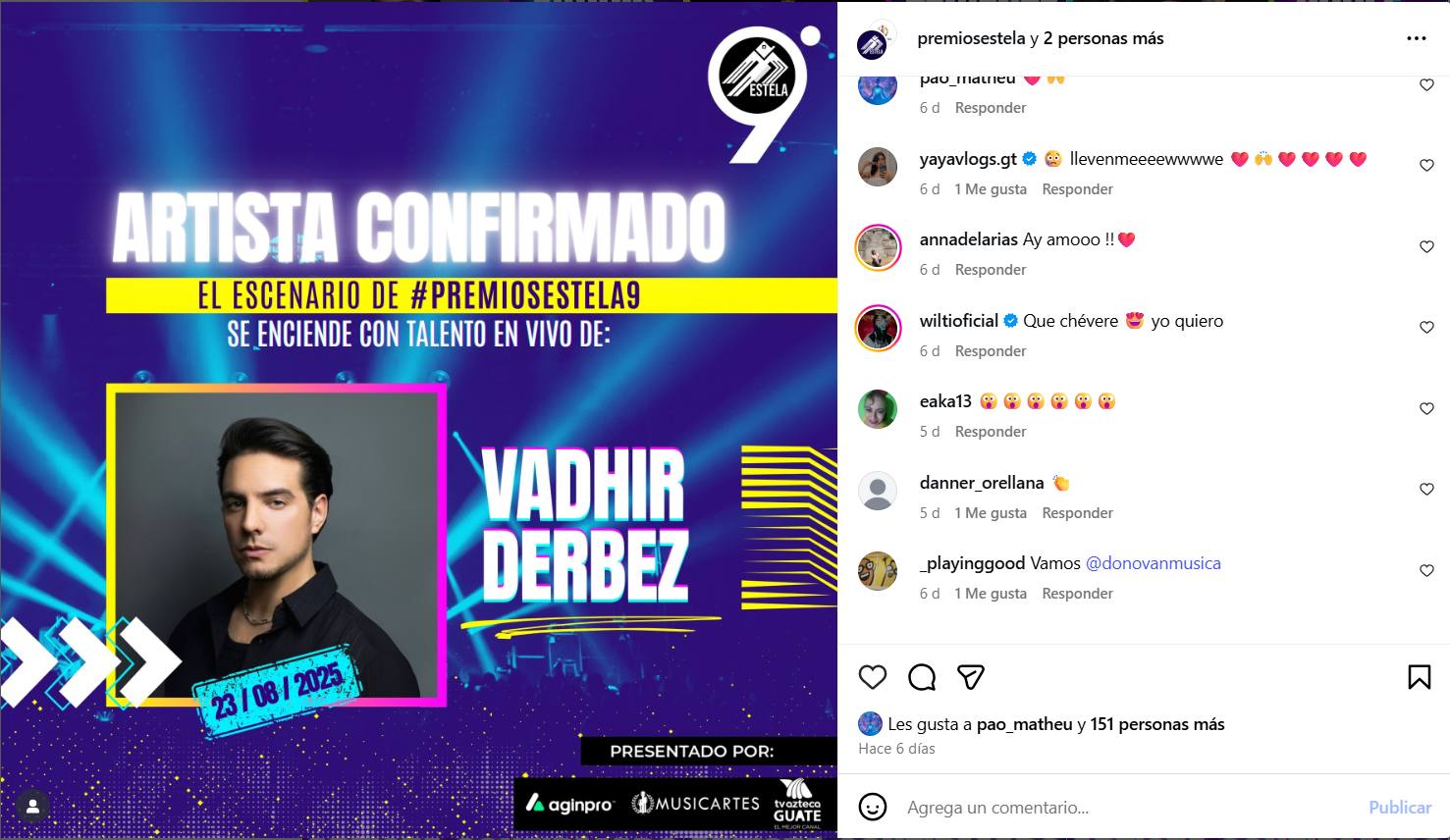 "Nos llena de emoción anunciar la participación especial del reconocido artista mexicano @vadhird en la gala de la 9na edición de #PremiosEstela! ?¿Ya tienes tu entrada?, Si aún no la tienes, cómprala aquí: https://viveloonline.com/shows/68373d42f6fc7ef13dc191b7 ?", se lee en la página de Instagram de los premios.