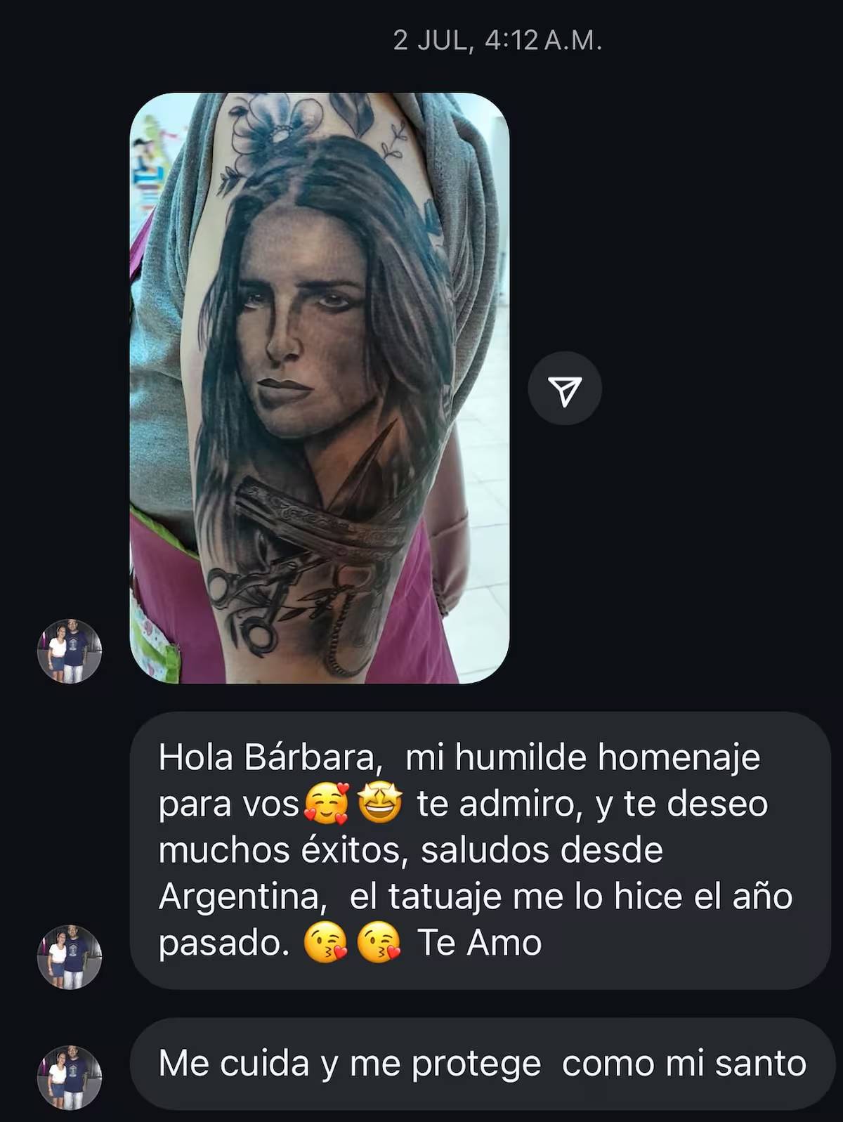 "Hola, Bárbara. Mi humilde homenaje para vos. Te admiro y te deseo muchos éxitos. El tatuaje me lo hice el año pasado. Me cuida y me protege como mi santo"