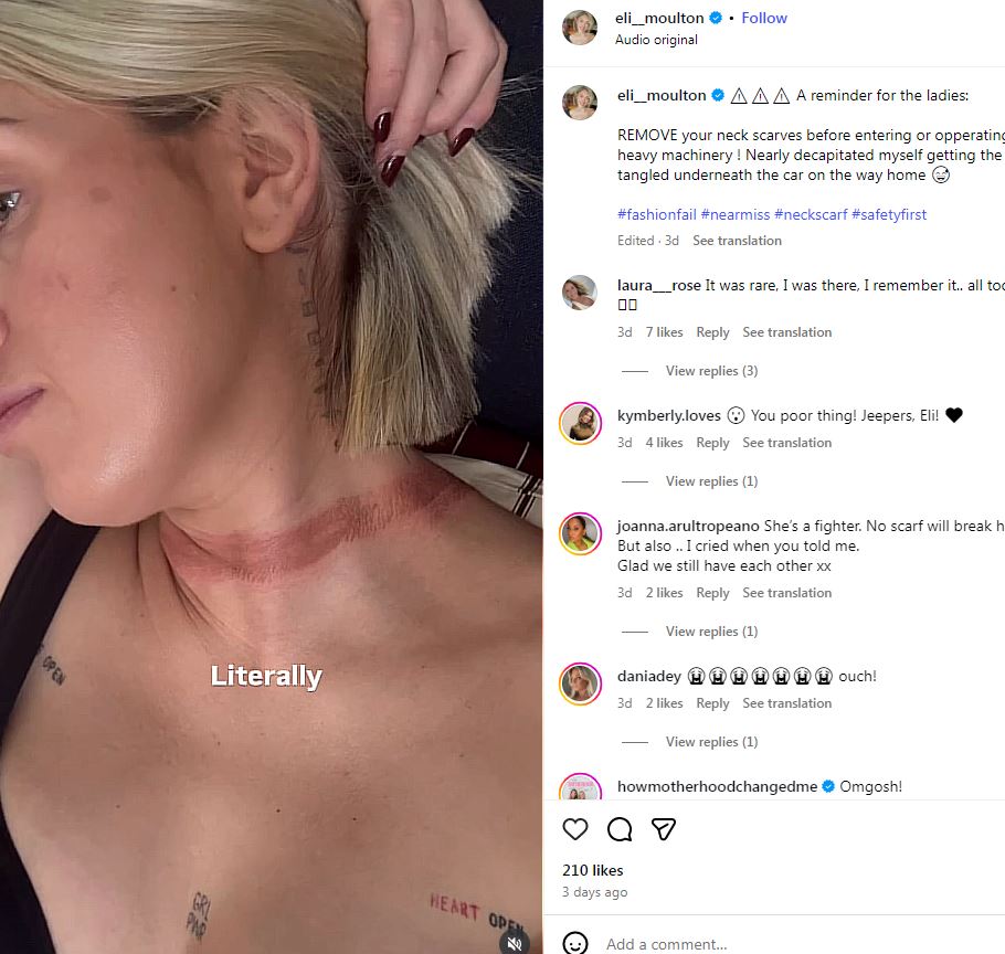 "REMOVE your neck scarves before entering or operating any heavy machinery! Nearly decapitated myself getting the scarf tangled underneath the car on the way home (Quítense las bufandas del cuello antes de entrar o manejar cualquier tipo de vehículo. Casi me decapito cuando la bufanda se enredó debajo del carro de camino a casa)", advirtió Moulton en Instagram.