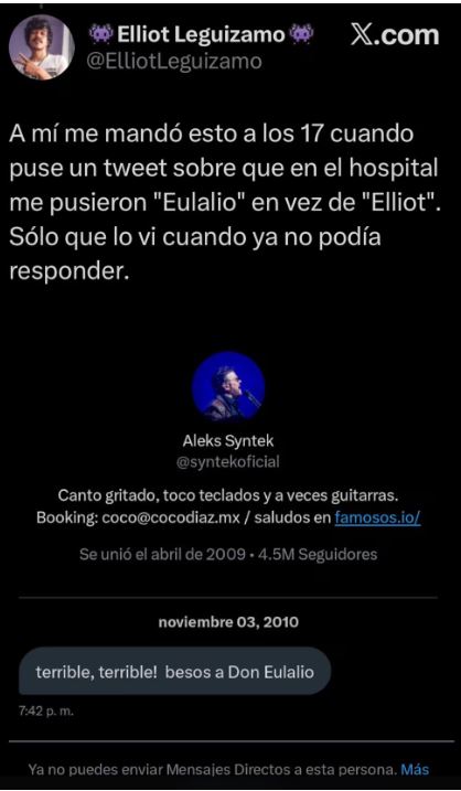 "Cada cierto tiempo recuerdo que Aleks Syntek me mandó un DM muy extraño cuando yo tenía 17, y lamento haber perdido la oportunidad de mentarle su madre", agregó.