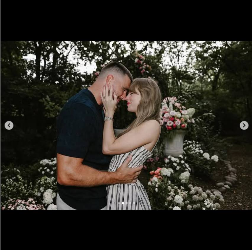 El posteo que hicieron en Instagram incluyó imágenes de la propuesta de casamiento. Se pudo ver a Kelce de rodillas en un jardín repleto de flores blancas, rojas y rosas.