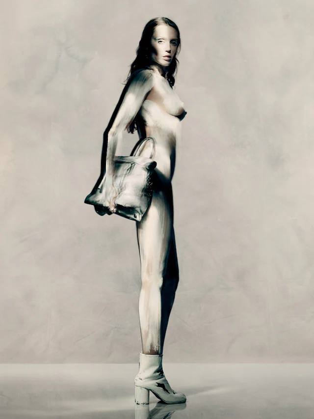 Miley Cyrus ahora posa completamente desnuda para la nueva campaña de Maison Margiela. Cubierta únicamente de pintura blanca y unas botas Tabi.