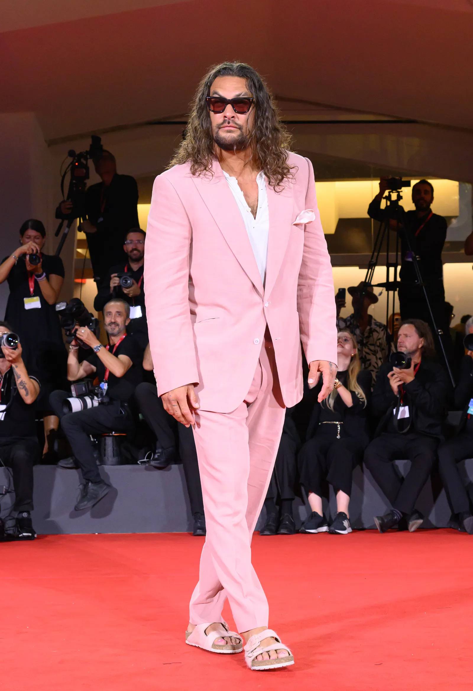 Como era su primera vez en el Festival ha querido que sea única y que todos lo recuerden. Así que, haciendo honor a su personal estilo Jason Momoa lució un traje rosa que ha combinado con unas chanclas del mismo color y las uñas de los pies pintadas, también, de rosa.