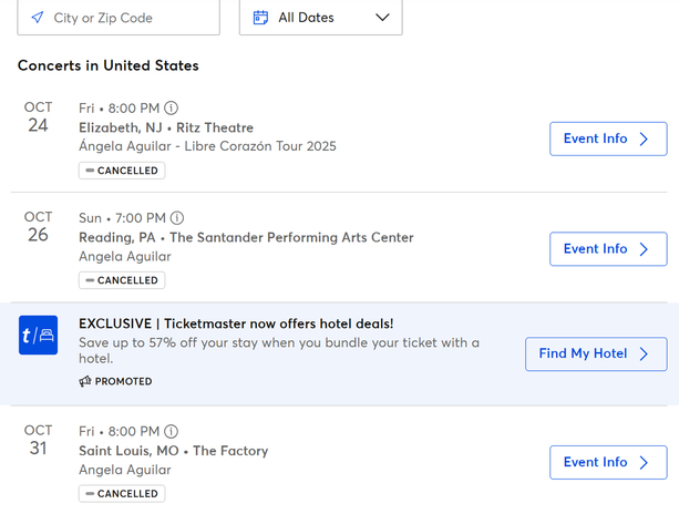 Los conciertos que siguen vigentes son en Indianápolis (Indiana), Chicago (Illinois), Dallas, San Antonio, Houston y El Paso (Texas); Atlanta (Georgia), Tucson (Arizona), Denver (Colorado), Los Ángeles, San José, Bakersfield, San Diego (California) y Las Vegas (Nevada) y aún se pueden conseguir entradas.