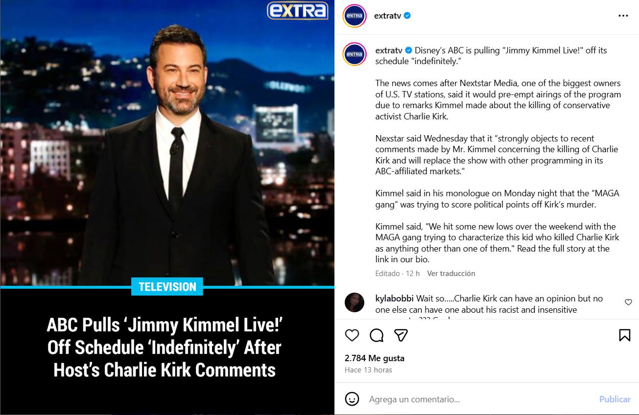 La cadena ABC, propiedad de Disney, anunció que retirará "indefinidamente" de su programación el popular programa nocturno de Jimmy Kimmel debido a los comentarios vertidos por el presentador sobre Charlie Kirk, el activista ultraconservador asesinado el pasado 10 de septiembre.