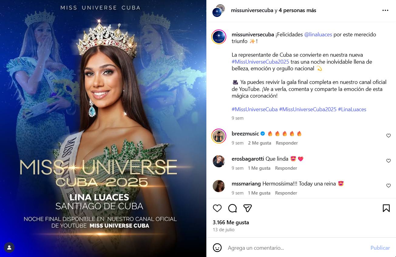 La hija de Lili Estefan se convirtió en Miss Universe Cuba 2025 la noche del pasado 8 de julio, por lo que será la encargada de representar al país en el certamen internacional de Miss Universo 2025, en noviembre.