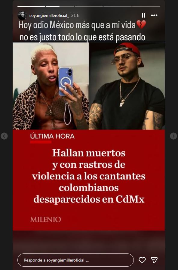 "Hoy odio México más que mi vida... no es justo lo que está pasando", expresó también Angie Miller en sus redes sociales.