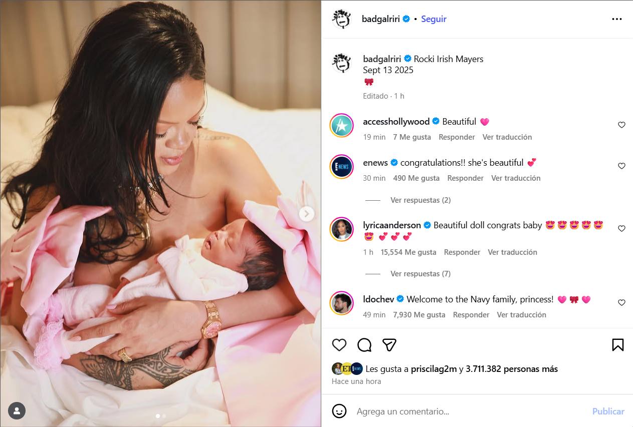 Los famosos anunciaron oficialmente el nacimiento de su tercera hija, Rocki Irish Mayers, mediante una publicación en Instagram donde Rihanna compartió una fotografía de la recién nacida envuelta en una manta rosada, junto a zapatitos o guantes de boxeo para bebé adornados con lazos de satín.