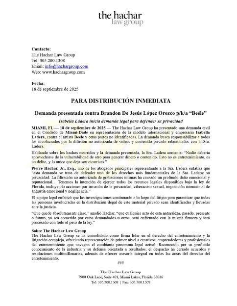"The Hachar Law Group ha presentado una demanda civil en el condado de Miami-Dade en representación de la modelo internacional y empresaria Isabella Ladera, contra el artista Beéle y otras partes no identificadas. La demanda busca responsabilizar a todos los involucrados por la difusión no autorizada de videos y contenido privado relacionados con la Sra. Ladera".