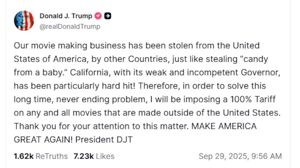 "Nuestro negocio cinematográfico ha sido robado de los Estados Unidos por otros países, como si le robaran un dulce a un bebé. California, con su gobernador débil e incompetente, ¡se ha visto especialmente afectada! Por lo tanto, para resolver este problema de larga data e incesante, impondré un arancel del 100 % a todas las películas que se produzcan fuera de Estados Unidos. Gracias por su atención a este asunto. ¡Hagamos que América vuelva a ser grande! Presidente DJT", señaló.