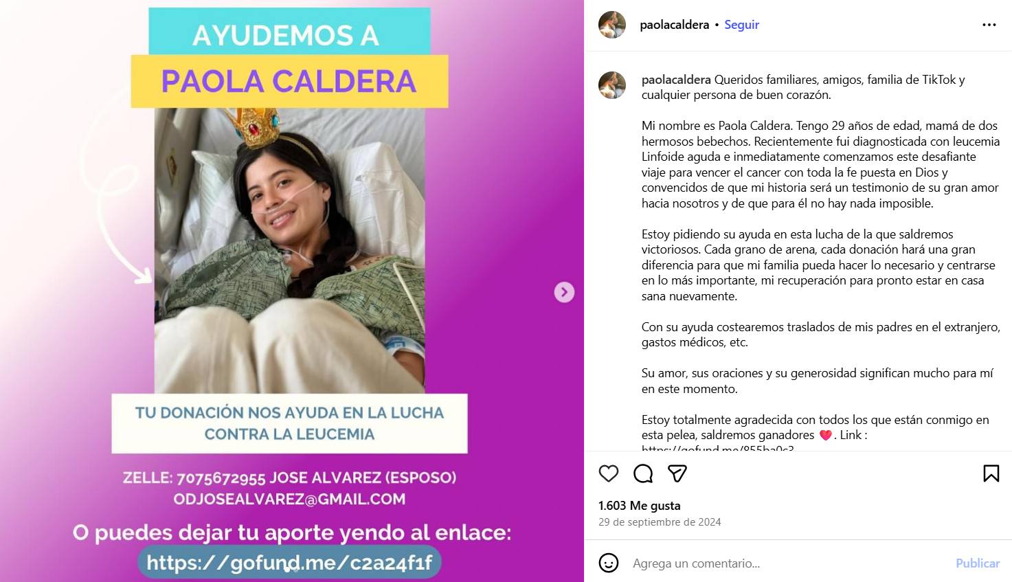 Tras ser diagnosticada con leucemia, Paola Caldera inició una campaña en la plataforma GoFundMe para cubrir los costosos tratamientos médicos.