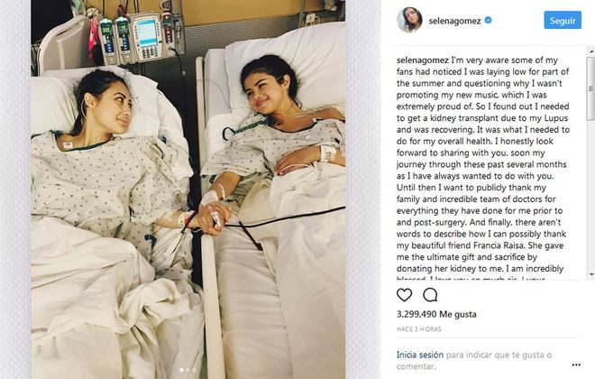 "No existen palabras que puedan describir lo agradecida que me siento con mi amiga Francia Raisa. Ella me ha hecho el regalo más importante y se ha sacrificado donándome un riñón. Estoy increíblemente bendecida. Te quiero mucho hermana", escribió Selena Gomez en sus redes.
