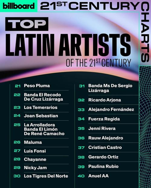 Este ranking se basa en el desempeño de los artistas en las listas Top Latin Albums y Hot Latin Songs desde enero del 2000 hasta diciembre del 2024.