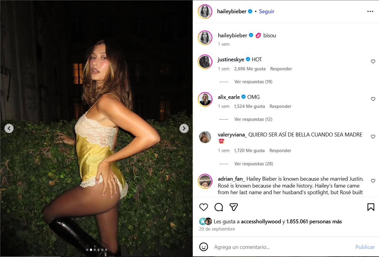 Hailey Bieber ha estado mostrando su lado sexy últimamente, especialmente durante la Semana de la Moda de París. En un evento, deslumbró con un mono amarillo que incluía un top de encaje con escote en V y pantalones cortos tipo boyshorts.