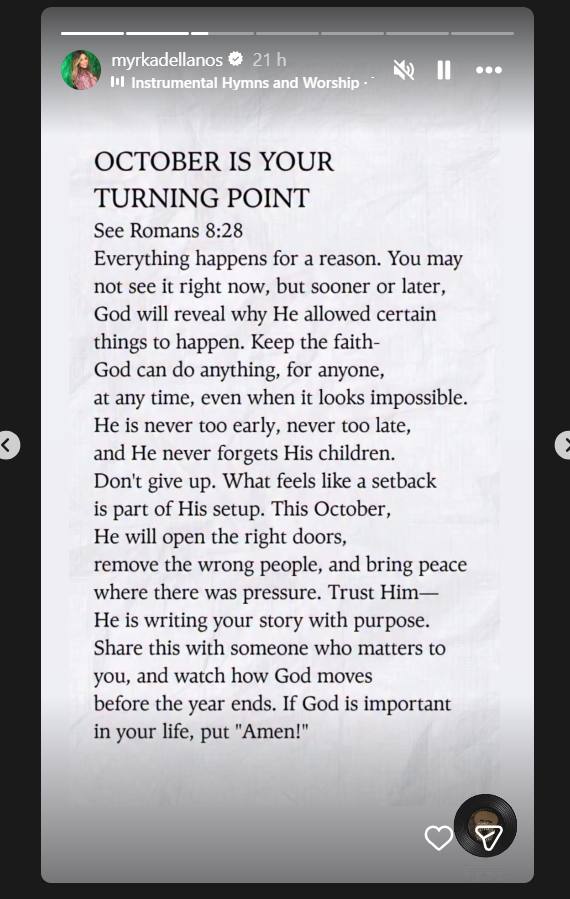 Aunque Myrka Dellanos no se ha pronunciado, sí compartió en las historias de Instagram un mensaje en inglés que los internautas han interpretado como la forma en la que está haciendo frente a esta situación.