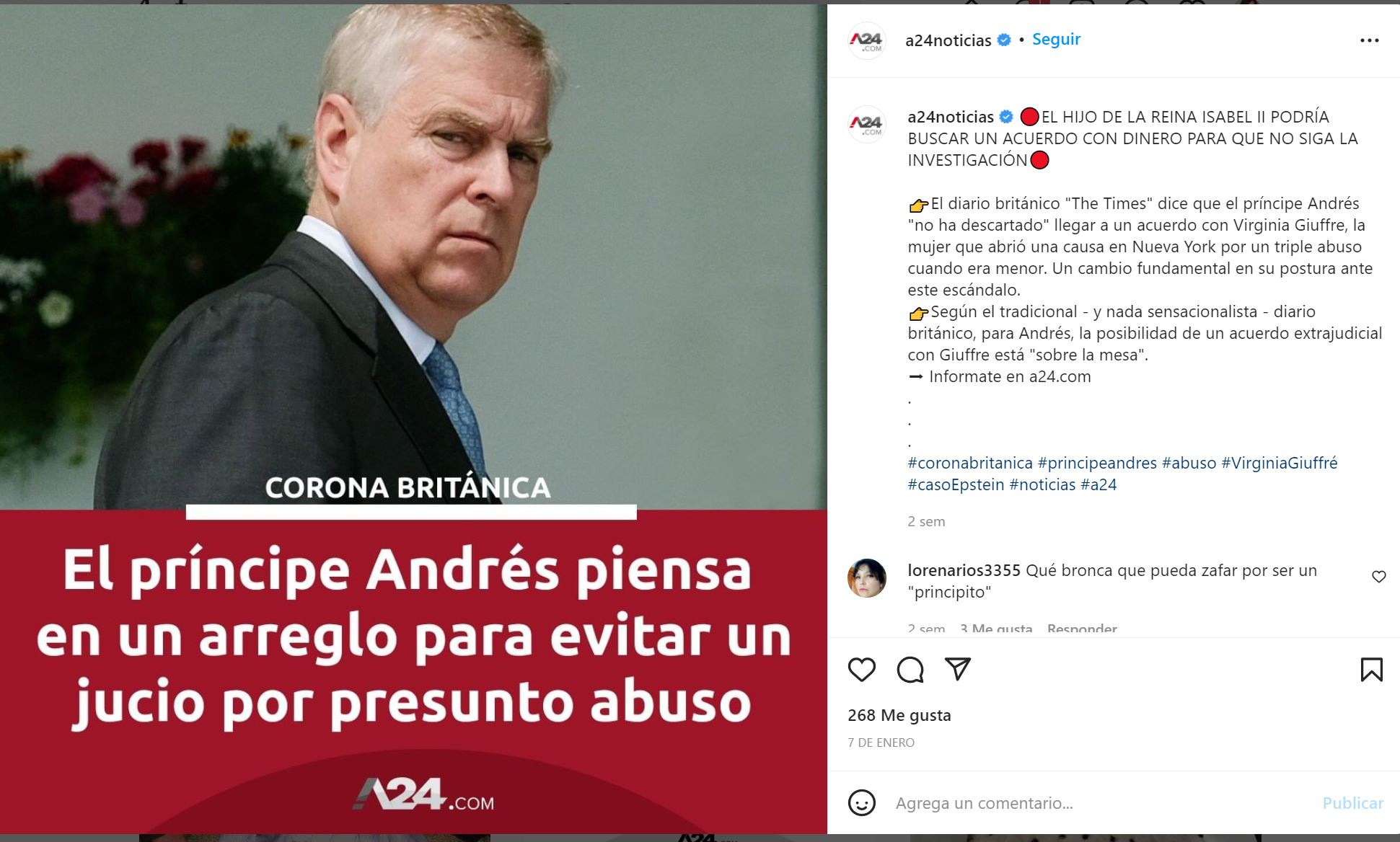 La decisión ocurrió después de que un juez federal de Nueva York rechazara una moción para desestimar una demanda civil contra él, que presentó Virginia Giuffre, una mujer que asegura que fue víctima de tráfico sexual con el príncipe cuando era menor de edad.